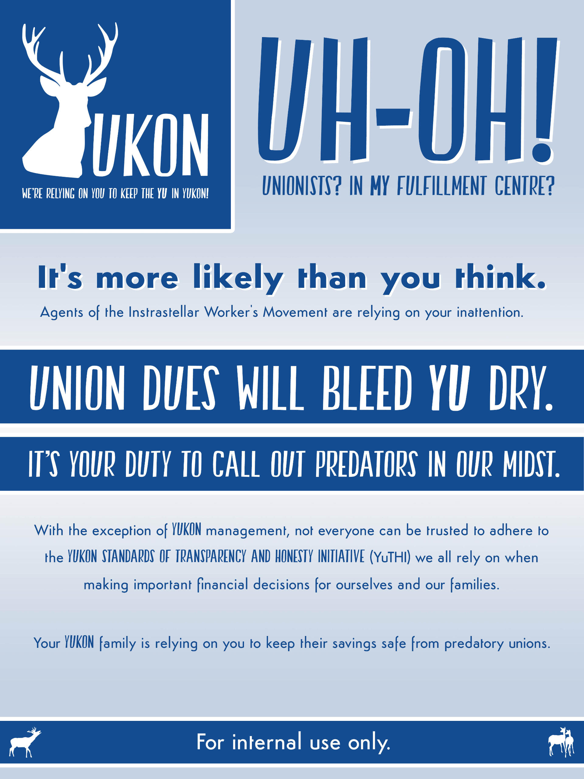 join them? Will you join us?The YuKon couriers are our family. Our siblings in the great fight for the rights of the worker. We must support them as they struggle against one of the most insidious institutions in the System. We must be willing to risk just as much as they. None of us are free from the chains of these corporations, if even one still remains yoked to them!Rise up alongside us! Bring the Couriers, and indeed every YuKon employee, in every facility around the System, into the Intrastellar Workers Movement. I am, myself, am going to Dion, to Production and Fabrication Facility 1990, to stand shoulder-to-shoulder with my siblings. The demonstrations have already begun. Together, as the Intragalactic Workers Movement, we will unite across the industries.One big galaxy—one big Union!